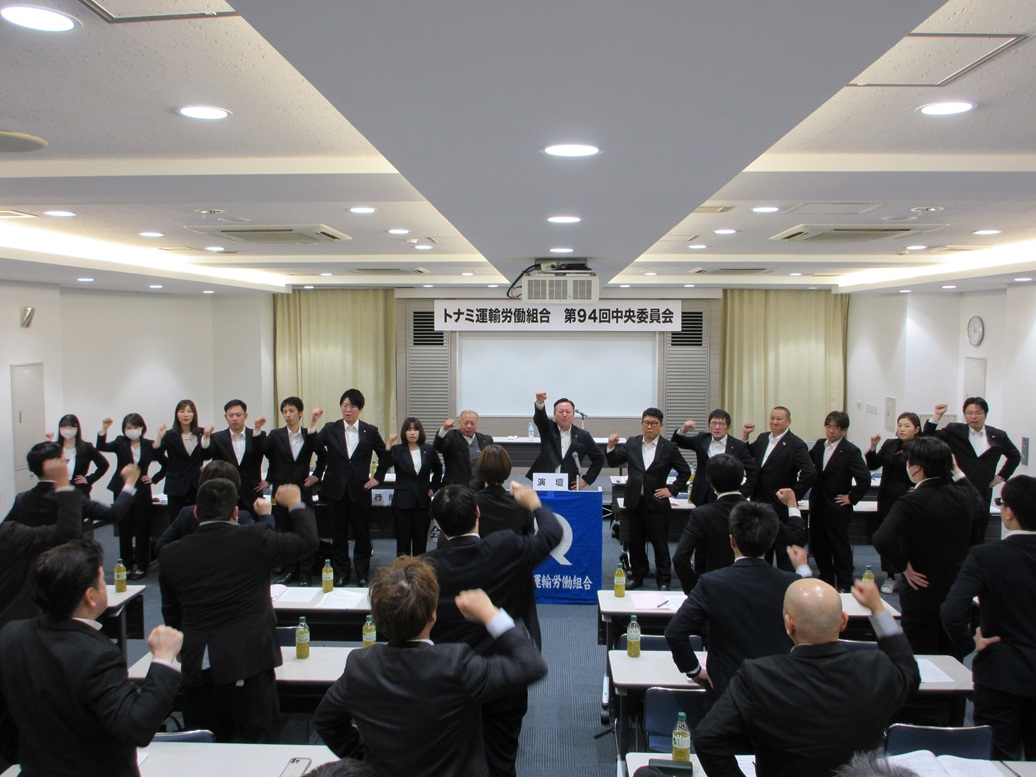 続いて、「第1号議案 春から秋にかけての取り組み」が提案され、「魅力ある賃金体系」「運行乗務員の賃金体系」「多様なライフステージに対応した休暇制度の新設」の質疑応答がされた後、金作委員長の発声でガンバロー三唱を行い、第94回中央委員会が終了しました。